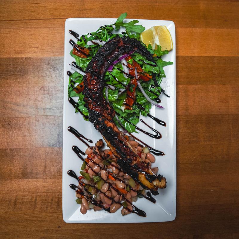 Charred octopus served with a cannellini bean salad and an arugula salad with oven-roasted tomatoes with a lemon vinaigrette.